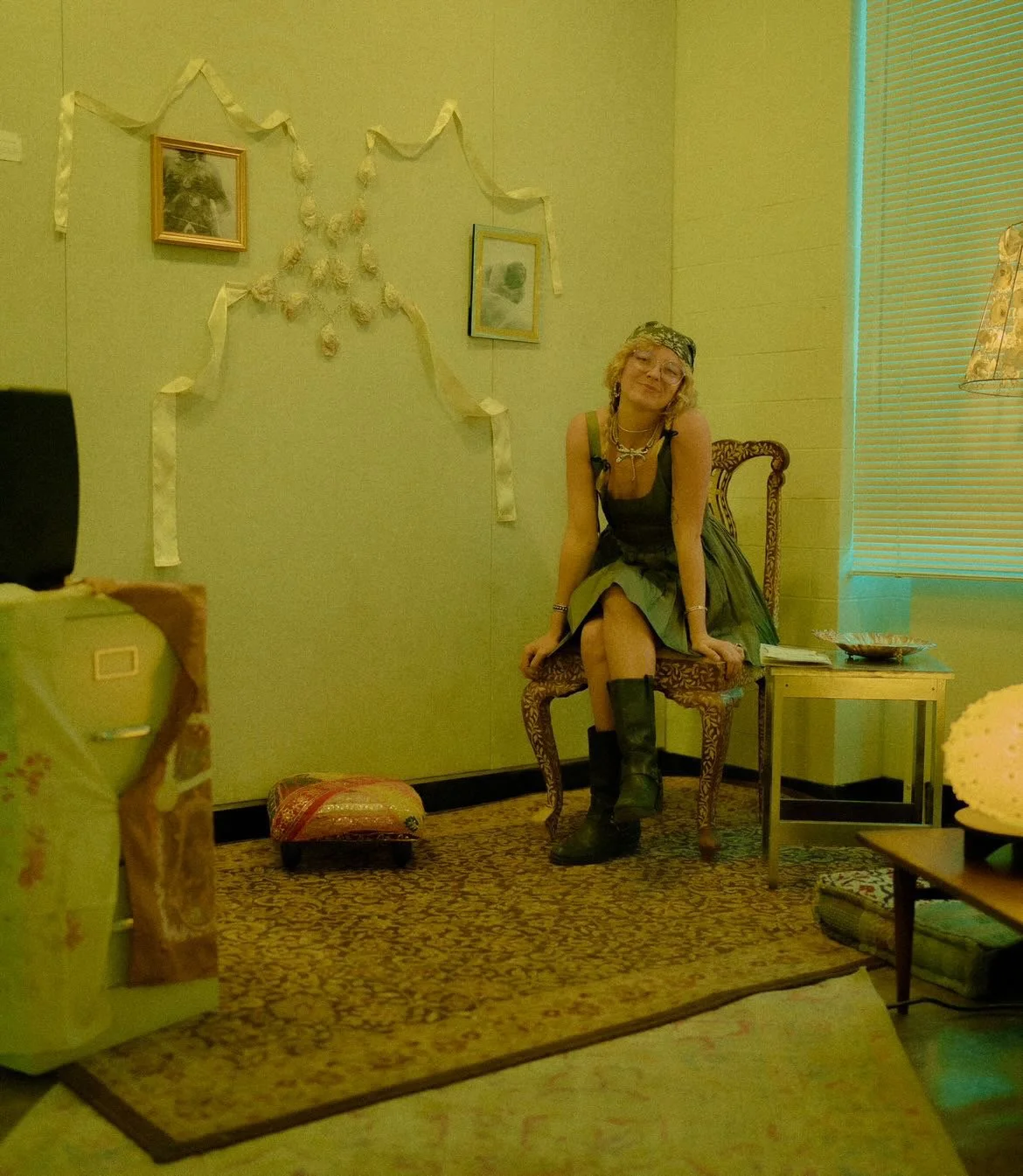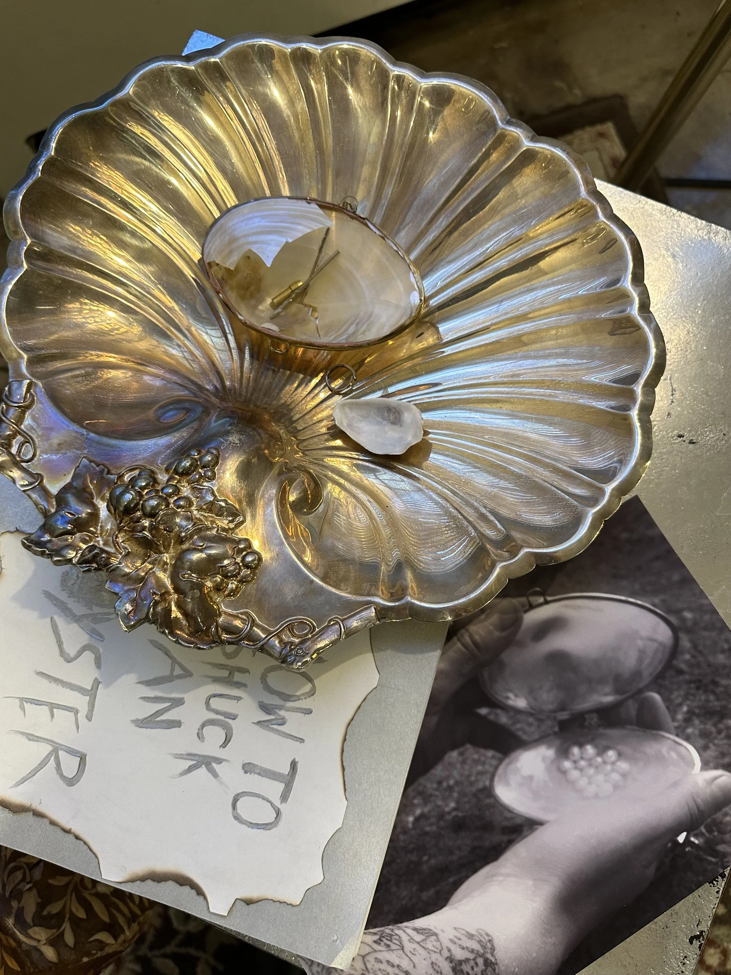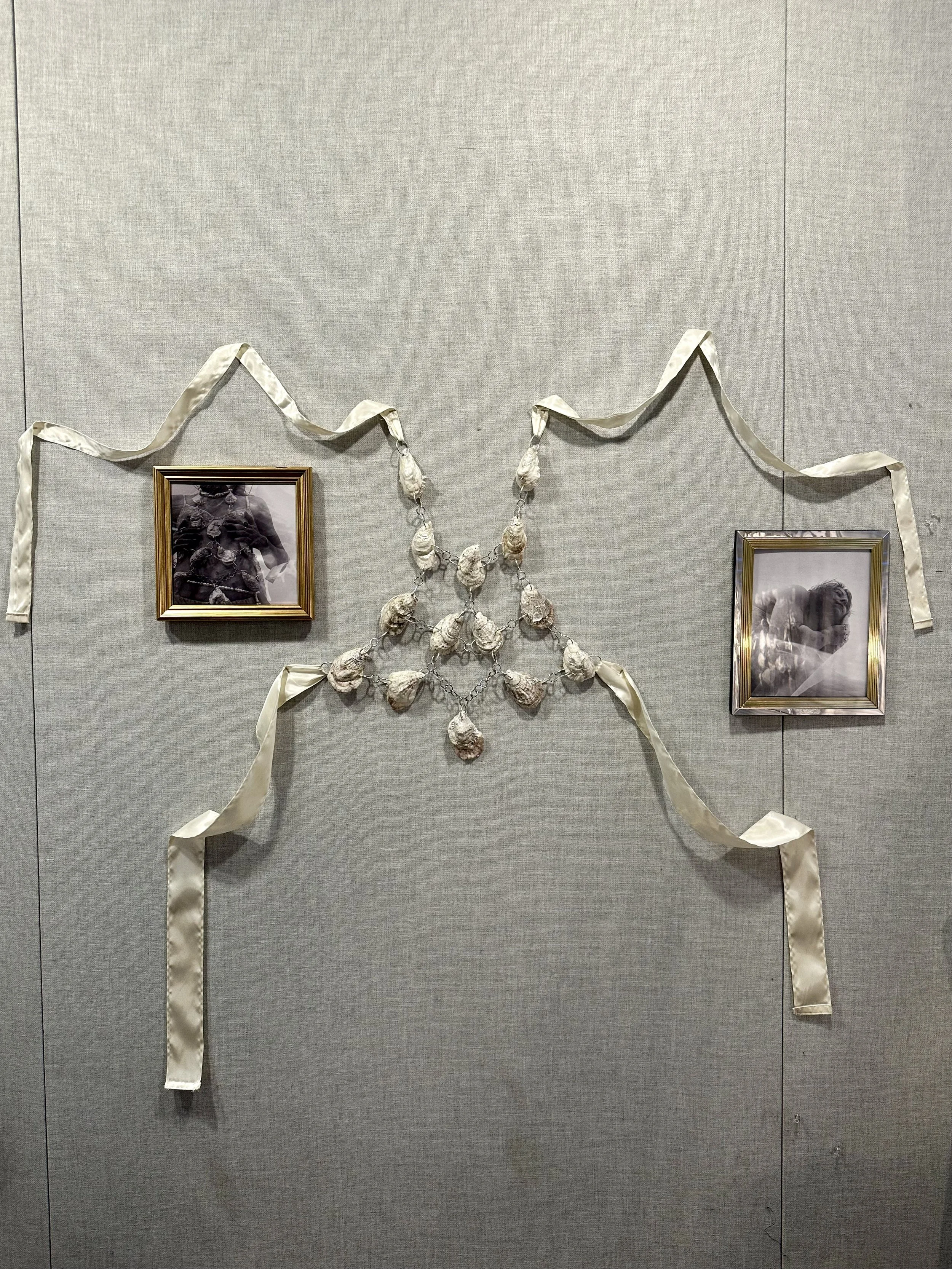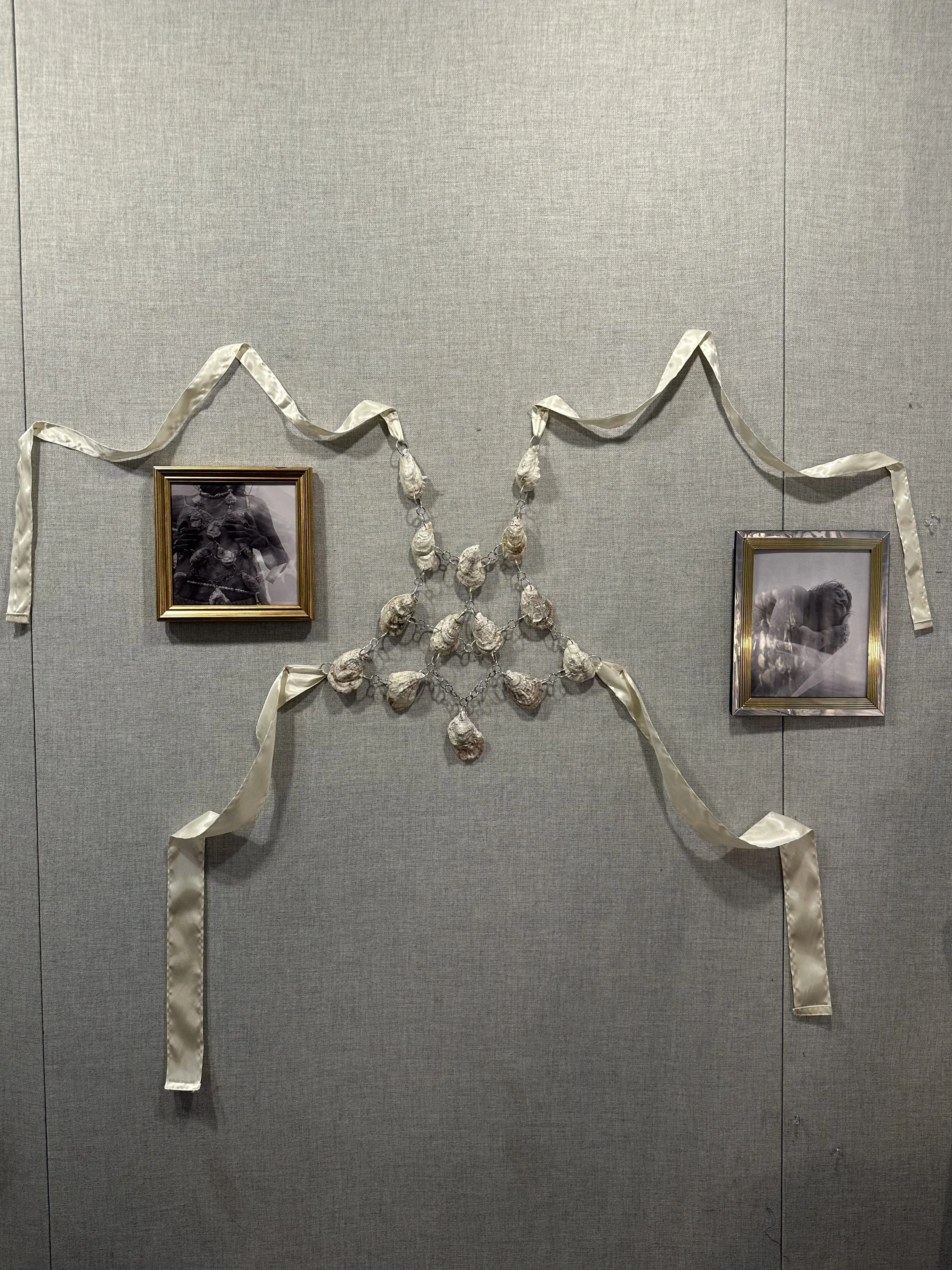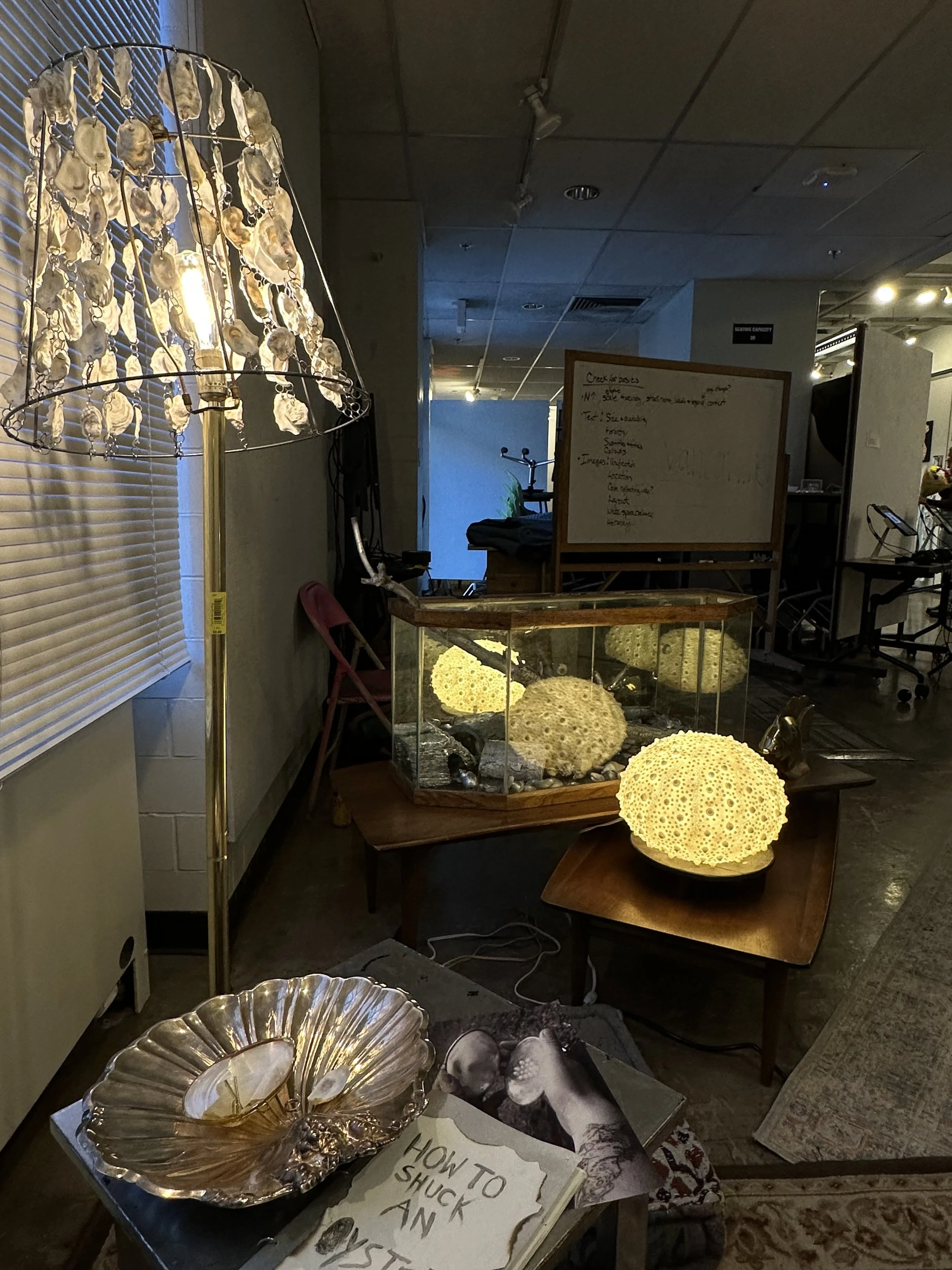 Pulling all mediums together, I showcased “How To Shuck An Oyster” through an interactive living room installation, allowing the viewer to immerse themselves in my own oyster bed. The story of the phyllum Mollusca was handwritten and meant to be read illuminated by the light of my oyster lamp, being the root to all other portions of my installation. The silent film played on loop through an old VHS, surrounded by an aquarium filled with branches and painted shells. In a shell dish laying scattered are the numerous worn drills bits withered from working on over 200 oysters. On the wall hang framed stills of the film, and in the center my oyster harness worn by Rhea.
